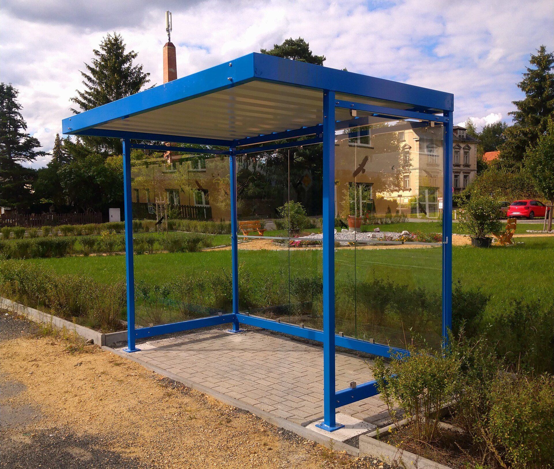 Das Häuschen aus Stahl und Sicherheitsglas haben die eigenen Mitarbeiter errichtet, ebenso Borde und Pflaster gesetzt. Thomas Lange will die hintere Seite als Werbefläche nutzen, um Fahrgäste so auf das Angebot der Sozialstation aufmerksam zu machen. Die Kosten betrugen rund 10.000 Euro.